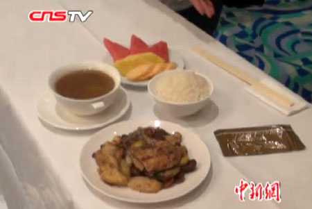 它这个筷子这样拿,这个菜在这里,菜先拿进来。拿好以后就是说,菜先放在这里。汤在这里,在这里喝掉。饭这样拿着吃。吃完他们如果要加的话,比如说要加饭了,要放这一个地方,放这个地方他们有比划,比如比这里,就是要添到这个下面。要是想加满就是这样,有一个比势的。不用讲话的,用手去比的,他不出声,斋堂的任何人都不能出声。