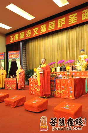 2012年4月24日,农历四月初四,是佛教四大菩萨文殊菩萨的圣诞,也是“玉佛寺三千佛洪名宝忏法会”圆满之日,上海玉佛禅寺在觉群楼多功能厅隆重举行庆祝“文殊菩萨圣诞的点灯祈慧法会”,此次法会由觉醒大和尚主法,约600余护法居士跟从寺院法师参加法会。