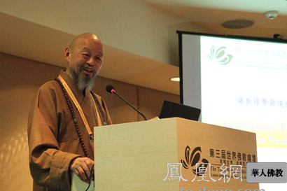 分论坛“佛教修学与现代生活的提升”现场,净慧长老演讲。(来源:凤凰网华人佛教 摄影:曹立君)