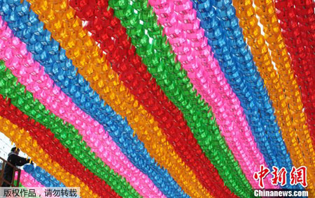 韩国寺院悬挂多彩灯笼迎接佛陀诞辰纪念