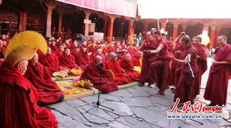 上午9时许,立宗答辩仪式正式开始。按照传统宗教惯例,首先举行无斋佛事活动。在考评委员会和众僧的监考下,8名考僧轮流答辩众僧提出的有关藏传佛教显宗《五部大论》(即《释量论》《入中观论》《现观庄严论》《戒律论》和《俱舍论》)方面的问难。