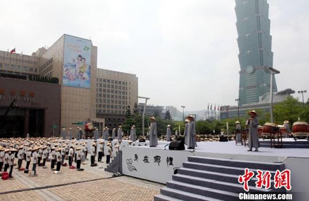 5月13日,台湾佛教名山法鼓山在台北市政府前广场举行“以禅浴心,以心浴佛”万人禅修活动。