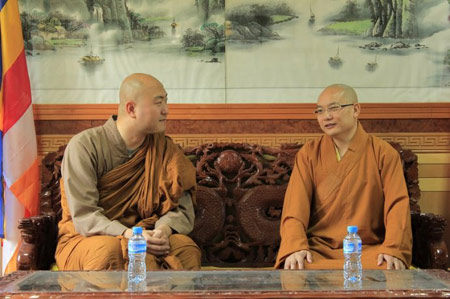圣悦法师和仁渡法师陪同海乐法师一行参观了法门寺寺院及法门寺佛学院,随后在后接待室贤空法师简单介绍了法门寺历史及“佛指舍利”重现人间之后的影响和法门寺的发展现状和前景。海乐法师对法门寺常住及法门寺佛学院的诸位法师的盛情接待表示感谢,并邀请各位法师去美国进行佛教文化交流,促进彼此间的宗教信众的感情。