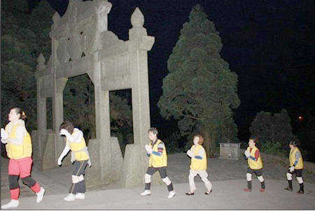 在出发前,法师领诵了《金刚经》,愿大家长金刚之智,练就金刚之身。大家也发愿绝不中途放弃,一定登上顶峰。出发不到半小时,夜幕降临。60人的队伍,间距2米,百余米的长龙,借着几盏微弱的手电筒光,在蜿蜒的山路上,一起一伏,缓缓前行。这夜,天公特别厚爱这群勇士,天气预报南岳当晚有阵雨,却一直没有落下来,仅仅在转钟前飘了几朵乌云。过了上封寺,快到山顶时,天空中繁星闪烁,悠悠山风吻面,吸去朝山者额上的毛毛细汗。大家有感,无上清凉,无比愉悦,征途的艰辛早抛脑后。