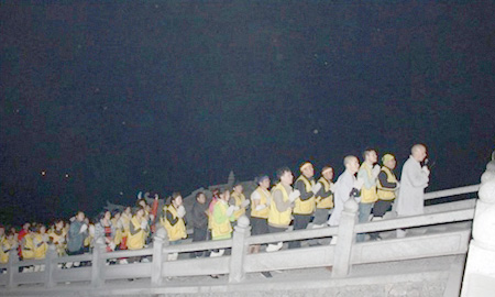 次日2时,到达山顶祝融峰。法师领着朝山队伍举行了祈福诵经仪式,祈愿世界和平、社会和谐、家庭和美、人心和善。