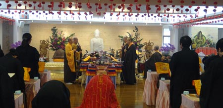 其间,数百位共修的信众鱼贯进入灵鹫山台北讲堂佛堂,佛堂内外形成一处修法的清静宝地,在大众共修的梵呗声中环绕出慈悲磁场,一同化成对十方有情众生的祈愿,要以祥和的慈悲力量给予2012年的台湾最诚挚的祝福。许多志工从早便在讲堂里忙进忙出,每个人发菩提心,无私奉献,所有与会的信众则在法会庄严摄受的气氛下,依序用餐,沉静互动,同沐法喜。