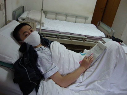 急性白血病患者郑国强在病床上依然坚持学习(图片来源:百灵网)