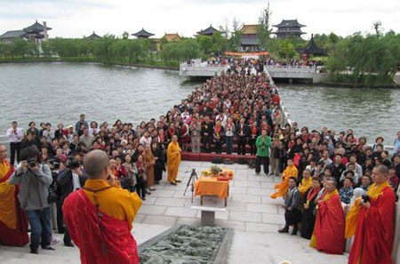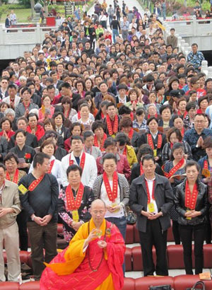 大型法务。下午1 :30,在崇恩书画展展厅——毗卢殿,隆重举行崇恩基金沙龙揭牌仪式暨“寻求智慧人生?佛学高级会考”颁奖大会。晚上6 :30,星光璀璨,梵乐嘹亮,在大雄宝殿广场隆重举行佛诞节“梵乐演出,传灯祈福”法会。晚上8 :00,传灯法会由悟端大和尚、世炫法师、能慧法师共同主法。在庄严的本师释迦牟尼佛的圣像前,大众虔诚诵经祈福。在诵《赞佛偈》时,千余盏鲜艳莲花灯,由法台依次传下,恭敬传递。大和尚衷心祝愿大家:世界和平、社会和谐、家庭和睦、人民安康、佛光普照!
