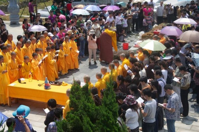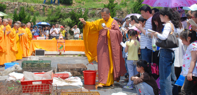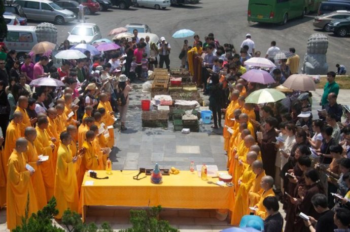 参加放生活动的信众共同祈愿:所放众生从此脱离异类身,转生善道,得闻佛法,得大解脱。