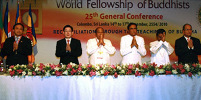 图为国家宗教局局长王作安(左二)出席于2010年11月16日在斯里兰卡首都科伦坡举行的第25届世佛联大会开幕式(图片来源:国家宗教事务局)