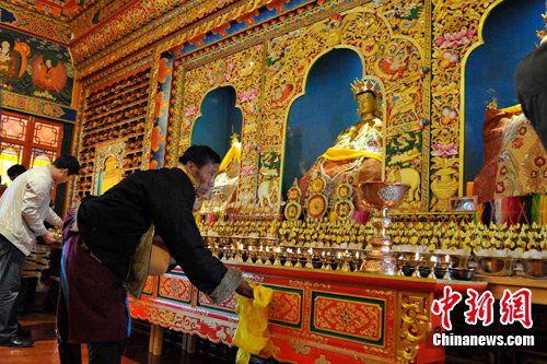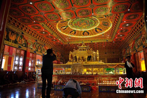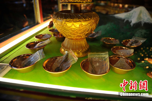 设计师鲁茸格登介绍,药师佛坛城制造用了三年的时间,完全按照经书里的尺寸、颜色,宽6米,高4.5米,是世界上最大的药师佛立体坛城。整个坛城用了1600多种香木,采用镀金制成,所有着色用的全部都是矿物原料,还收集到了世界上最珍贵的360多种药材。药师佛玻璃光如来,是一位至高无上的药学佛。而药师佛坛城又称为药师曼陀罗,藏语称“米拉吉廓”,是藏传佛教的宇宙。理想境界的集中表现,为一切圣众聚会场所。这里同样包括世上所有珍贵药物,为众生脱离苦海。