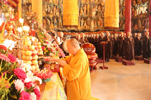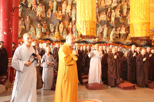 上午9点45分,上印下顺大和尚一行抵达大金山寺,寺内钟鼓齐鸣,香花灯仪仗队引路,两序大众恭迎上印下顺大和尚一行到达大雄宝殿,维那师起《炉香赞》,上印下空长老陪同上印下顺大和尚在大雄宝殿拈香礼佛,祈愿世界和平,国泰民安,风调雨顺。礼佛毕,大众师父和居士一同顶礼上印下顺大和尚三拜。