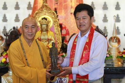 黄毅赠送中国远征军纪念碑复刻雕像给心道法师留念(图片来源:台湾灵鹫山 摄影:吴文礼)