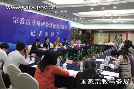 2012年6月5日下午,国家宗教局在上海举行了宗教活动场所管理经验交流会记者招待会。中国佛教协会副会长学诚法师,中国道教协会副会长黄信阳,国家宗教局研究中心主任张训谋、一司副司长刘威、政法司政策研究处处长李寒颖作为受访嘉宾出席记者招待会。