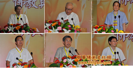 北京大学楼宇烈教授发言(左上),中国社科院杨曾文教授主题发言(中上),华东师范大学李向平教授评议(右上),香港中文大学人间佛教研究中心学愚教授发言(左下),中国社科院魏道儒教授主题发言(中下), 日本爱媛大学邢东风教授发言(右下)