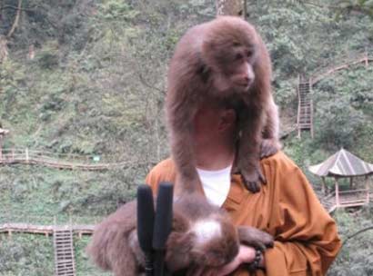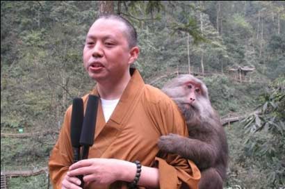 爱卖萌的延参法师遇上峨眉山猴子再次微博走红(图片来源:中国日报网)