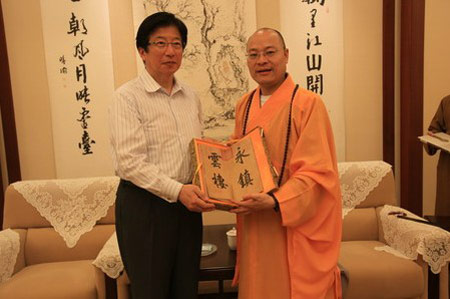 灵隐寺方丈光泉法师代表寺院向日本客人赠送了董其昌书《金刚经》印本和《灵隐寺》画册