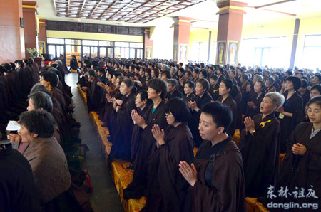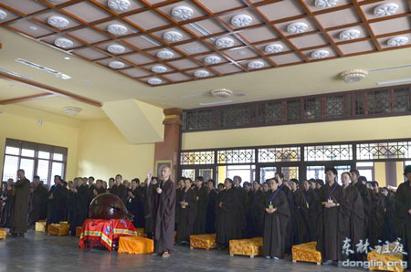 13日下午2时40分,昼夜经行念佛法会接近尾声,东林首座本通法师引领四众佛弟子进行回向仪式。至下午3时,24小时昼夜经行念佛法会圆满结束。