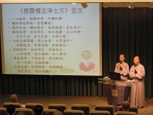 随后由常遂法师和常麓法师共同发表“慈云忏主净土文资料整理与教案设计”,内容则是根据“圣严法师随身经典系列”中的《慈云忏主净土文》讲记,做为研究底本,两位学僧法师藉此规划出十二堂课程大纲,透过活泼善巧的教案设计,引发出学习者的求学渴望,并提供修持净业的行者,能从务实的修持面著力,坚固对于净土法门的信心。