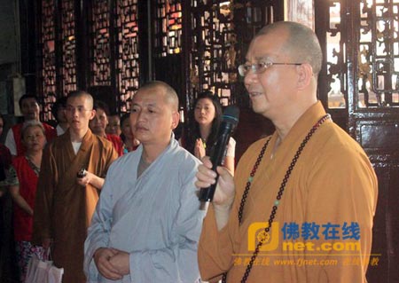 学诚法师在大雄宝殿为信众们慈悲开示,他讲到二十一世纪的出家人除应具备的基本素质外,还应全面发展,接触世间技能,广学多闻,在家信众也应学习寺院基本礼仪等基础的佛学常识。