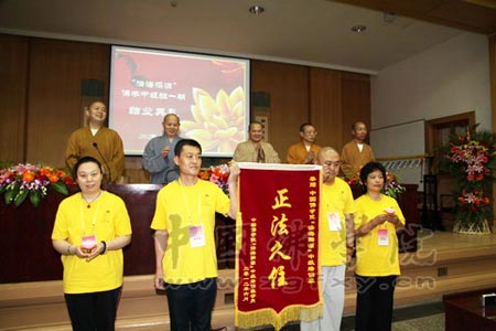 在结业典礼上,几位法师亲自为学员们颁发了结业证以及富有重要意义的纪念品。学员代表为佛学院赠送了锦旗,上书“正法久住”。学员班班长发表了结业感言,细抒一年来的修学收获与感恩之心。在结业典礼上,学们员们都共同祈愿“法海探源”培训活动持续长久地开办下去,以利益更多众生。
