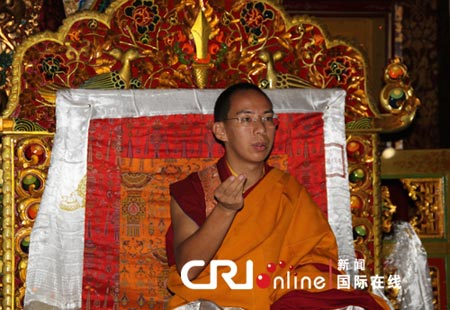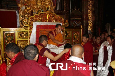 第十一世班禅大师为大昭寺的众僧摸顶赐福,并发放布施(图:国际在线)