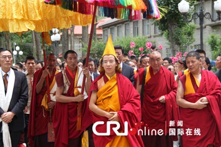 7月24日清晨,第十一世班禅额尔德尼·确吉杰布朝拜大昭寺举行佛事活动(图:中广网)