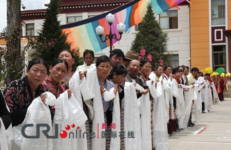 群众列队恭迎班禅大师(图:国际在线)