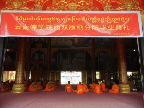 2012年7月17日,首届“送教育进佛寺”初中班和第五届“傣汉双语”中专班毕业典礼在云南佛学院西双版纳分院举行,西双版纳州政协副主席、云南佛学院西双版纳分院院长祜巴龙庄勐、西双版纳州教育局党组书记依拉罕、州民宗局副调研员刀红、西双版纳职业技术学院副院长王永坤、西双版纳州第二中学校长杨天云、西双版纳州民族中学副校长刘正萍、西双版纳昊缘旅游发展有限公司副总经理钱君、西双版纳职业技术学院、西双版纳州第二中学任课教师、佛学院师僧及学僧家长共200余人参加了典礼。