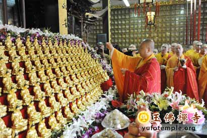 作为寺院的固定项目,玉佛寺每年都会不定期在佛菩萨纪念日中举行纪念法会并为居士所请佛像举行开光仪式。今天除了纪念观音成道法会外,还为居士在观音殿所请的200多尊金樟观音圣像进行开光。