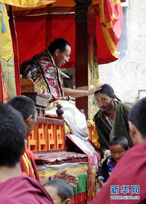 班禅大师在平措林寺大院内为信徒摸顶(图片来源:新华网)
