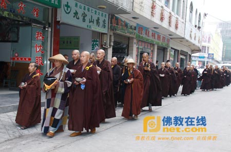 2012年8月3日(农历六月十六),湖北省通山县九宫山无量寿禅寺举办托钵行脚活动,无量寿禅寺方丈圣钦法师带领出家僧众外出托钵乞食,广结善缘。
