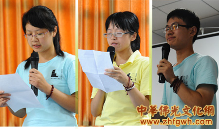 然后,义工代表表达了对此次禅修营活动的感恩。付出、奉献是与收获一起的,义工们虽然付出了自己的汗水、时间和经历,却收获了聆听佛法的机会,收获了布施的机会,收获了放下我执的机会,收获了很多的朋友。而营员代表也表达了对法师们开示的感恩以及对无私奉献的义工们的感恩。并表示会把在这里学习到的和悟到的一直实践下去。