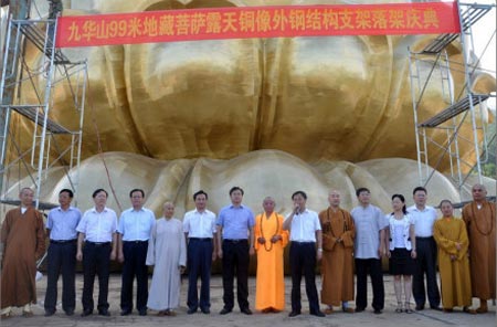 2012年8月6日上午,安徽九华山举行99米地藏菩萨露天铜像外钢结构支架落架仪式。随着外钢结构最后一根支架的落架,标志着99米地藏菩萨露天铜像主体工程基本竣工。