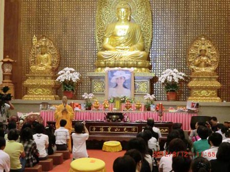上午11时,由佛光山丛林学院男众学部院长慧得法师主法,大众法师于新宝塔大殿为凤姐60岁冥诞诵经回向,并在佛号声中凤迷每人手持一朵鲜花,献给他们最敬爱的凤姐,场面庄严、温馨感人。慧得法师开示: “凤姐就好像是我们的家人,让大家很不舍,又好像是菩萨示现,这一世来唱歌给我们听;跟我们结缘,希望借着念佛、将菩萨的功德力回向,并接引她去清净的国土西方极乐世界,安住在那里,然后保佑我们大家;身体健康、事业顺利、家庭幸福。”