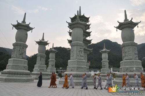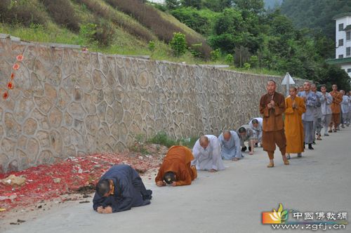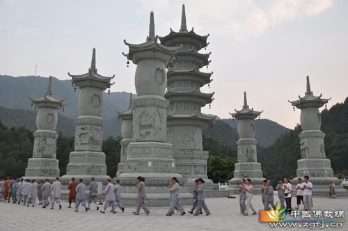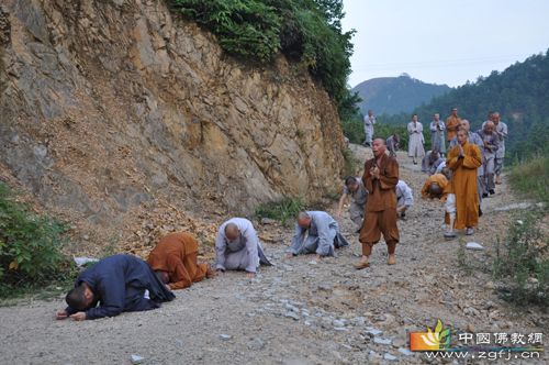 2012年8月27日近黄昏时,六祖寺禅修中心禅定法师带领几十个男女短期出家众来到六祖八塔,大众有序礼佛、绕塔,在南无阿弥陀佛圣号中开始了三步一拜礼佛话动。