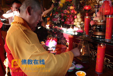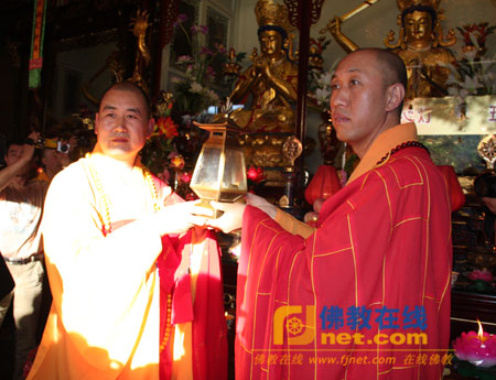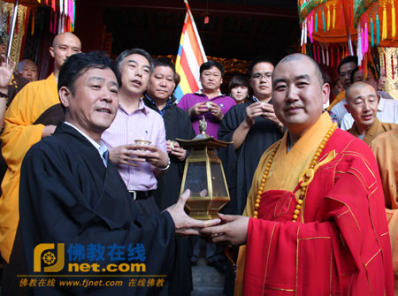 将点燃的“智”灯交给雪窦山方丈怡藏法师手中