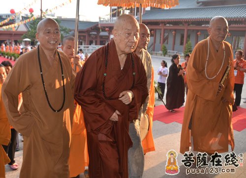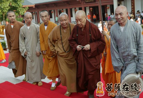 印觉大和尚(左四)迎接净良长老(右二)与济群法师(右一)(图片来源:菩萨在线 摄影:心慈)