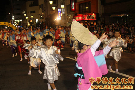 舞蹈队伍中还有不小小孩子和中小学生,也穿着鲜艳的服装,和大人一样有板有眼的舞蹈着。快到20时了,广播播放着还有四分钟结束,观众们也纷纷加入舞蹈的队伍,现场已经分不出演员和观众来,大街上被欢乐的人的海洋淹没了。恐怕能够全民参与的特点,才是阿波舞的最大魅力。