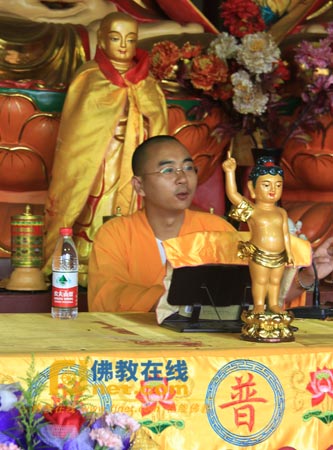 应湖北黄石目连寺住持文慧法师邀请,在目连寺四众弟子的至诚祈请下,2012年8月19日,浙江省奉化市弥勒佛学院讲师宏辉法师于寺院盂兰盆供法会之期,莅临目连寺,在大殿就如何开启福慧之门一题与在座的众多居士进行了探讨,并回答了居士们的相关提问。
