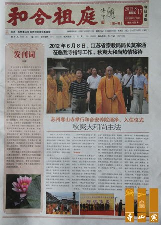 为进一步弘扬寒山寺和合文化,苏州寒山寺《和合祖庭》报于2012年8月17日(农历七月初一)正式发行。中国佛教协会会长传印长老为本报题名,中国佛教协会常务理事、江苏省佛教协会副会长兼秘书长、苏州寒山寺、重元寺方丈秋爽大和尚为报纸撰写了发刊词。