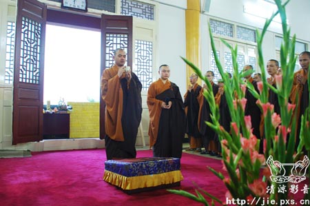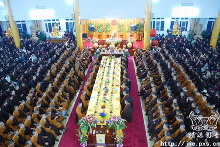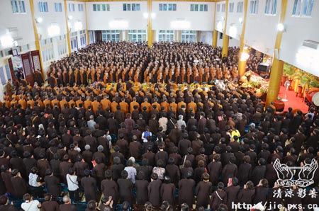 2012年8月29日(农历七月十三)晚,福建省福鼎市太姥山平兴寺于结夏安居即将圆满之际,在圆通殿举行蒙山施食法会。法会现场,平兴寺常住诸师及信众约千余众讽诵经咒,回向亡故六亲眷属,蒙佛慈力,罪业蠲除,往生净土。(图:清凉影音工作室)
