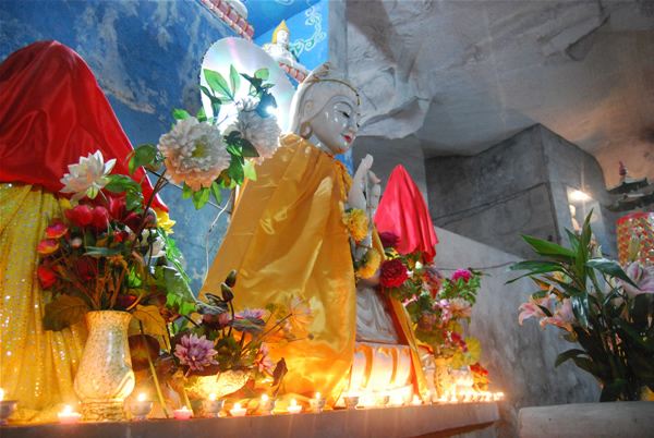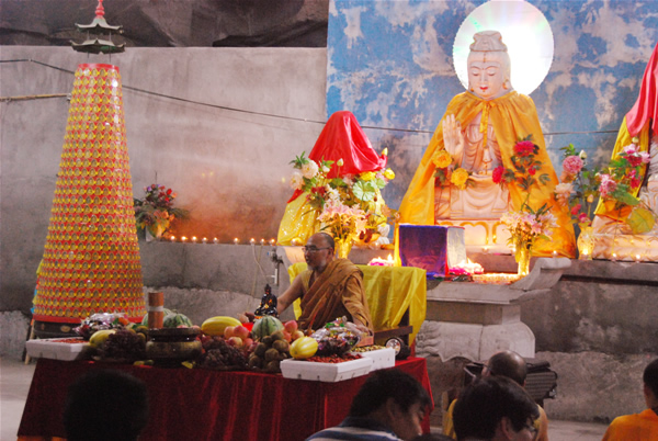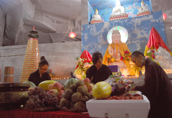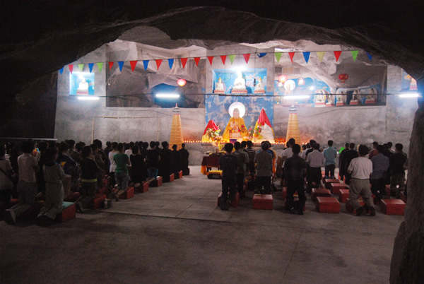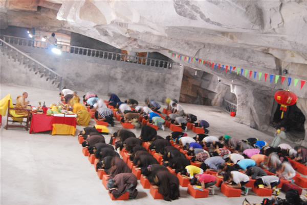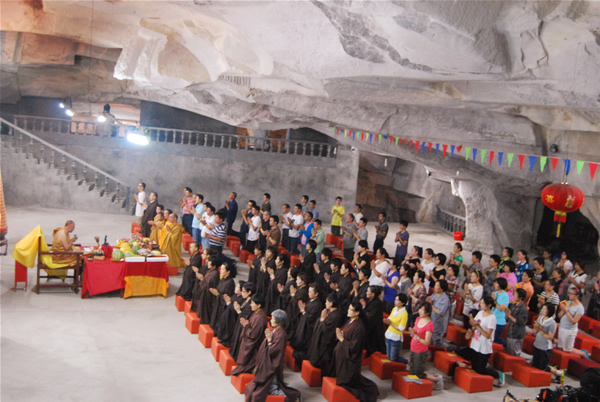 2012年08月29日(农历七月十三)上午,天台山慈恩寺在寺院洞窟内举行药师佛灌顶法会。法会由具有该法门法脉传承的智渡法师主法;来自全国各地80多名己修习《药师佛大愿持诵法》、愿意受持菩萨戒的信众、寺院部份常住参加了此次法会,灌顶法会从上午08:30 开始,11:50 结束。