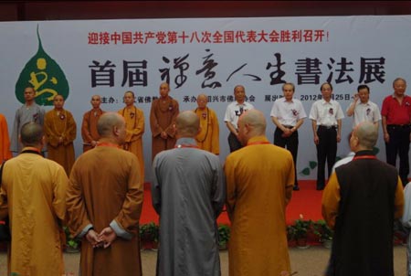 为迎接党的十八大胜利召开,由浙江省佛教协会主办,绍兴市佛教协会承办的首届“禅意人生”书法展,于2012年8月25日上午在绍兴博物馆隆重开幕。中国佛教协会咨议委员会副主席、江苏省佛教协会名誉会长、常州天宁寺方丈松纯长老;中国佛教协会副秘书长宗家顺;浙江省佛教协会会长、宁波雪窦寺方丈怡藏法师及社会各界人士约200余人参加开幕式。浙江省民宗委副主任倪忠扬出席开幕式并讲话。