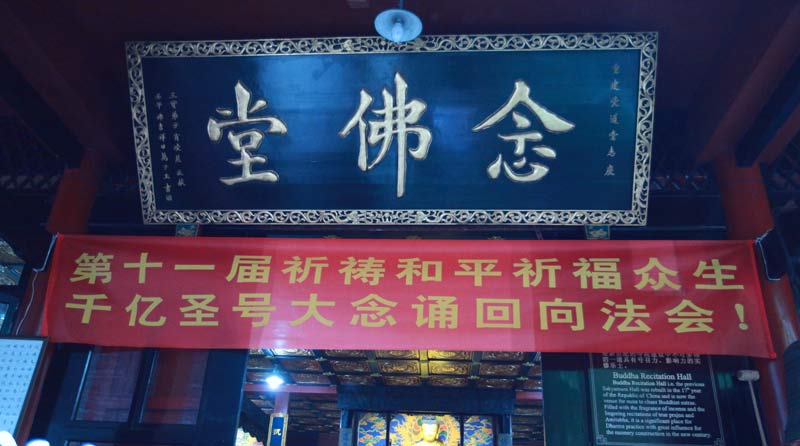 2012年8月31中午14点,成都爱道堂也同步隆重举行了第十一届千亿圣号大念诵回向法会!法会在念佛堂举行,念佛堂门前悬挂着第十一届千亿圣号大念诵横幅!