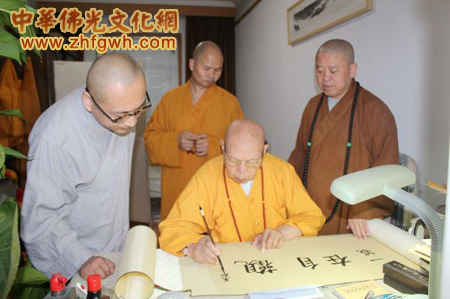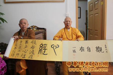 在一诚长老做了简短的开示后,纯一法师将最近创作的12米长的草书《心经》长卷呈请斧正,一诚长老说到:历代写经高僧都用自己的恭敬心、清净心、至诚心书写佛所说一切经典,正闻熏习,彰显佛法,流传后世,并与人结缘,广弘奥义。希望纯一法师能够发扬这一优良传统,续佛慧命。最后,一诚长老当即为之题跋“观自在”。(纯一法师微博)