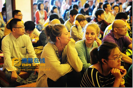 下午龙泉寺监院禅兴法师致词:现在这个时代我们拥有难得的历史机遇——中华文化大发展、大繁荣、文化输出的伟大时代。在这样一个时代有志于从事翻译的各届同仁大家都有机会把自己的聪明才智奉献出来,共同促进中国文化向世界各国的传播。中国优秀传统文化以“儒释道”为代表,“儒释道”文化的核心特质在于“心文化”,就是重视人的心性的养成、品性的提升、以及道德的圆成,在这一点意义上来说“儒释道”拥有共性的特点。与此相对应的世界上其他地区的文化有欧美地区为典型代表的“神文化”以及近现代以科学主意兴起后形成的“物文化”。但是神文化和物文化在其演变过程中都遇到了一些时代的问题和困难,现在物质主义泛滥以及所带来的各种环境自然的危机,让人们越来越多的青睐于东方的历史传统文化,尤其是以“儒释道”三家为代表,因此我们完全可以自豪的说中华文化拥有普世价值,在这样一个时代我们每一个中国人都有自己的责任和义务向全世界传播中华民族优秀的传统文化。希望更多有缘人今后能一起携起手来共襄盛举为中华文化的传播做出我们应有的贡献。”
