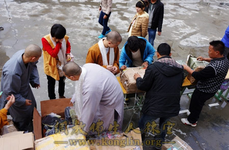 文殊院的法师、义工整理分发给同学们的物资