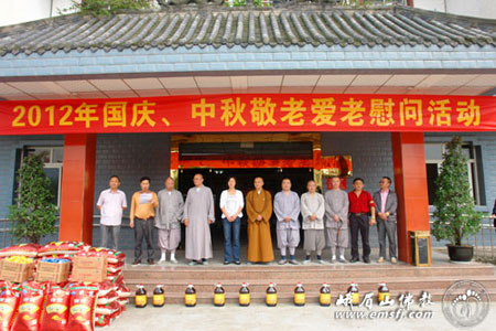 在中华民族传统佳节中秋节即将到来之际,为响应国家宗教局、四川省宗教局、乐山市宗教局及中国佛教协会、四川省佛协的号召,认真贯彻落实《关于在全国开展“宗教慈善周”活动的通知》精神,充分发挥佛教在建设和谐社会中的作用,继续保持、发扬峨眉山佛教协会乐善好施、关爱老人的优良传统。峨眉山佛教协会在会长永寿法师的带领下,于2012年9月20日至23日,在峨眉山市展开了以“敬老爱老”为主题的宗教慈善周活动。