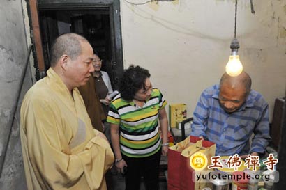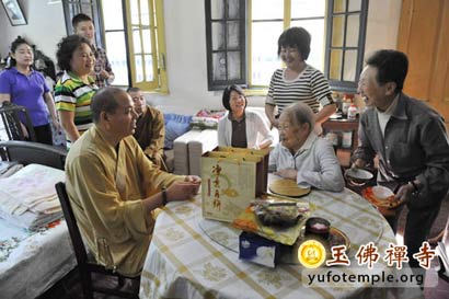 一年一度的中秋佳节即将来临,2012年9月18日上午,上海玉佛禅寺寺务处主任长春代表方丈觉醒法师,带领寺院法师和觉群慈爱功德会人员来到徐汇区一位百岁老人和两位孤寡老人家中,为他们奉上玉佛寺自制的净素月饼,表达本寺上下敬老爱老的一片心意。